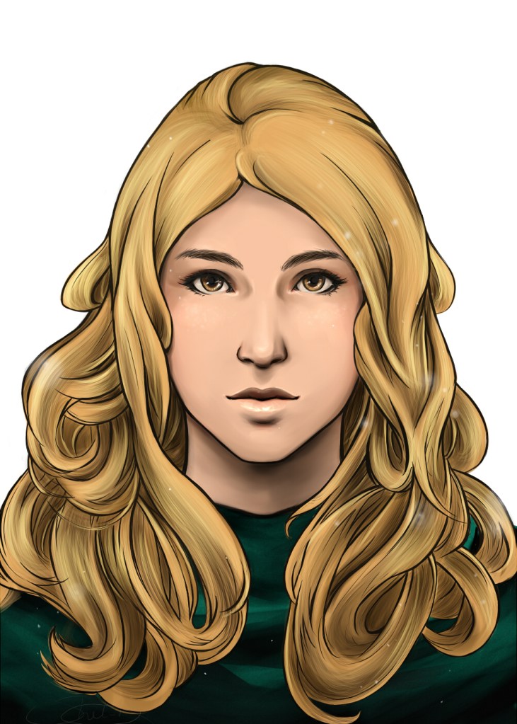 Eye Color/Hair: Brown/Golden Blonde and Curly